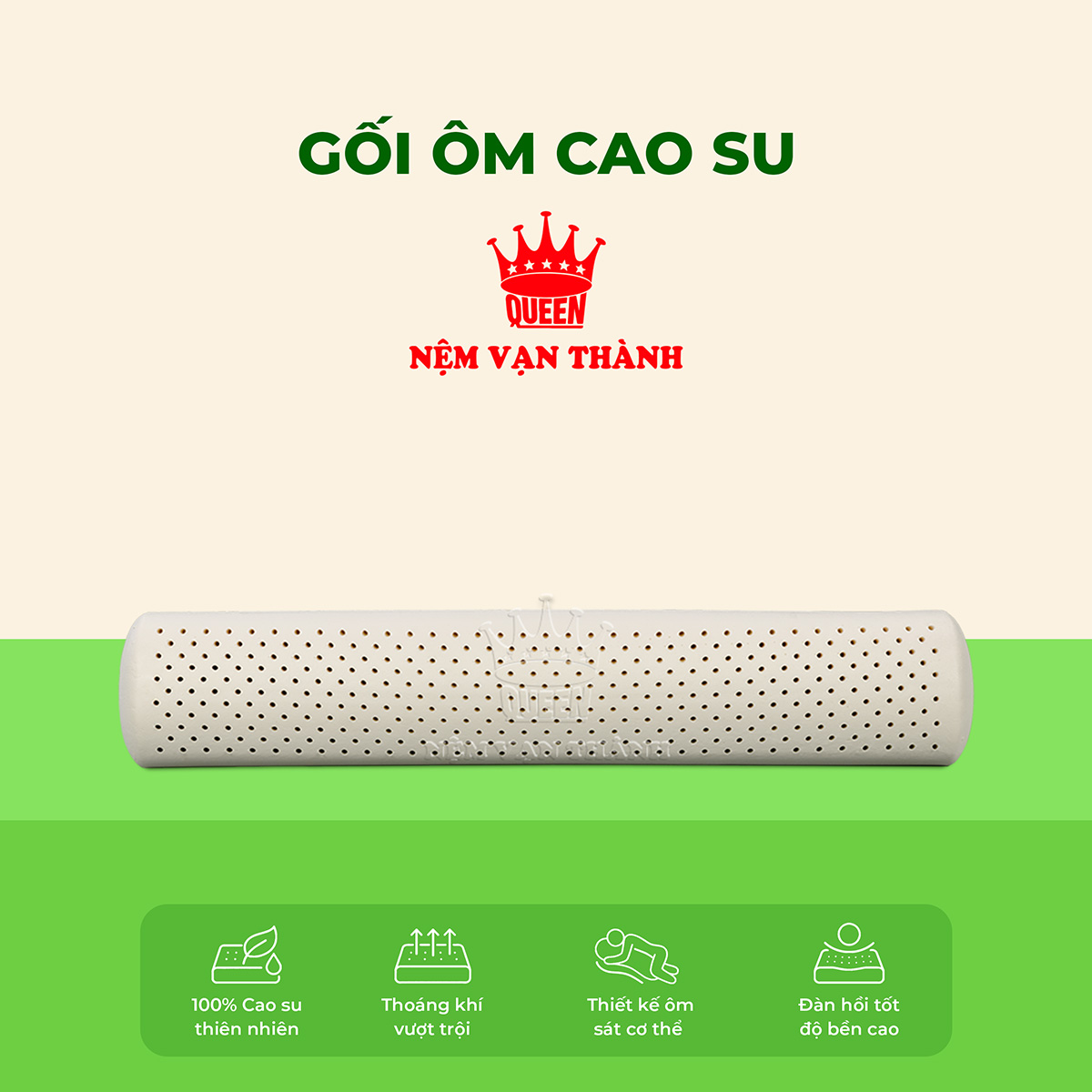 Gối ôm cao su Vạn Thành dáng trụ thon dài, mềm mại, giúp người dùng thư giãn toàn thân khi ngủ, tựa lưng, hoặc gác chân.