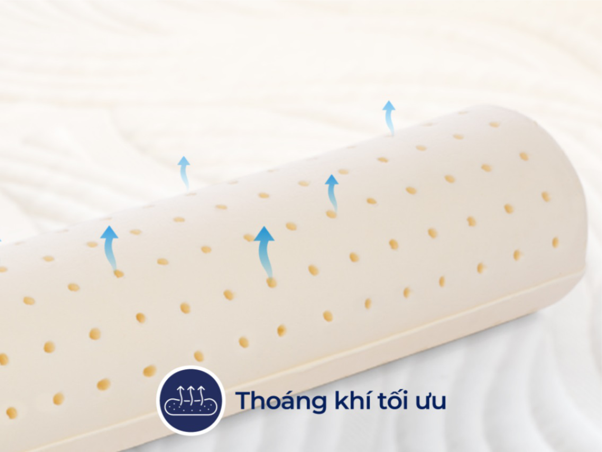 Chất liệu cao su thiên nhiên với cấu trúc bọt khí hở giúp không khí lưu thông tốt và ngăn ngừa tích tụ hơi nóng. Hệ thống lỗ thông hơi bề mặt gối cũng góp phần quan trọng giảm thiểu tình trạng hầm nóng, ra mồ hôi trộm và nổi rôm sẩy khiến bé thức giấc giữa đêm và quấy khóc. Chưa kể cao su thiên nhiên sở hữu tính năng kháng khuẩn, kháng nấm mốc tự nhiên, giúp tăng cường bảo vệ môi trường ngủ của con.