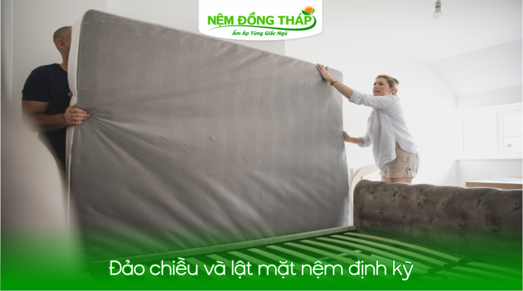 Đảo chiều nệm từ đầu xuống chân và lật mặt nệm ít nhất 3-6 tháng/lần. Điều này giúp nệm không bị lún một chỗ và giữ độ đàn hồi đều ở mọi vị trí, giúp gia tăng tuổi thọ nệm.