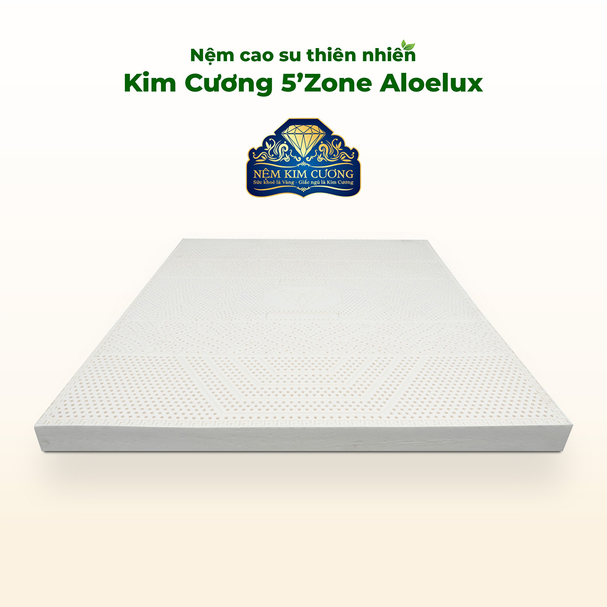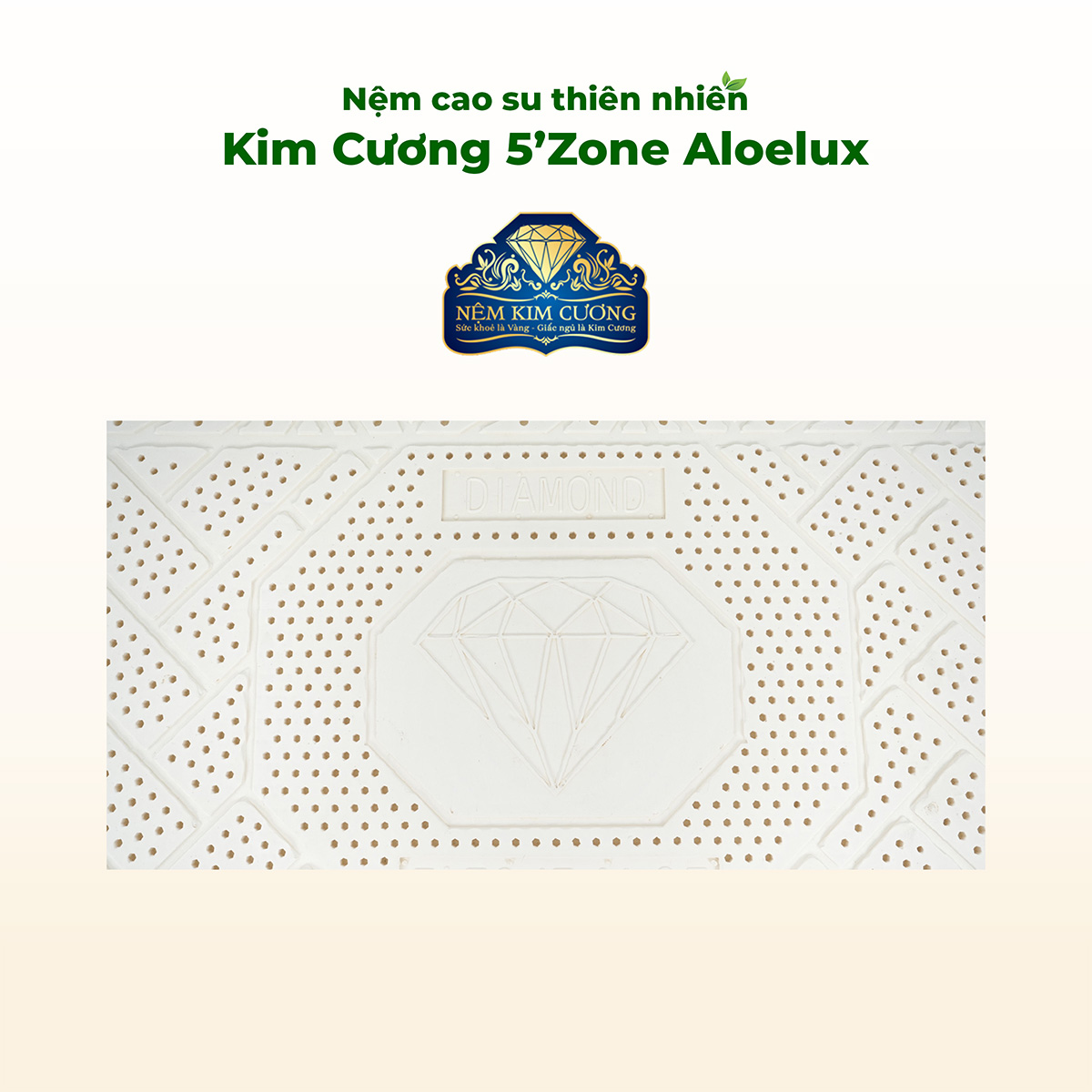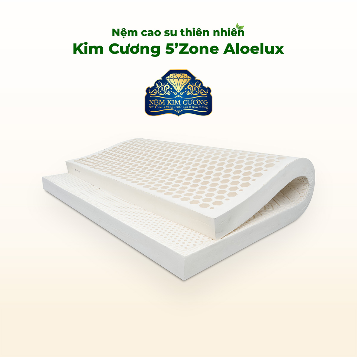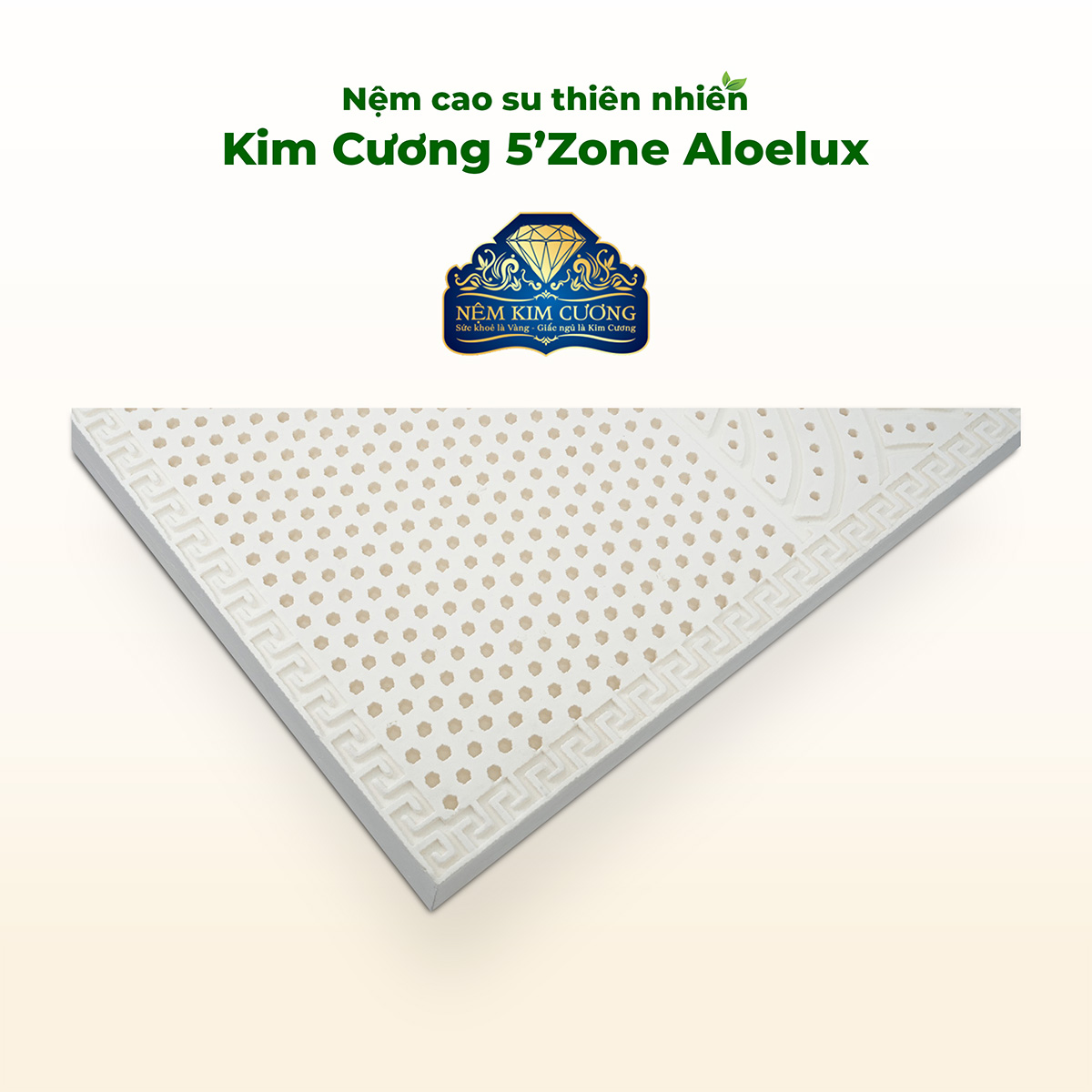 Nệm cao su thiên nhiên Kim Cương 5’Zone Aloelux được làm từ 100% cao su thiên nhiên. Kết cấu nệm phân làm 5 vùng, tương thích với 5 vùng trọng điểm trên cơ thể, lần lượt là: đầu, lưng, hông, đùi, chân.