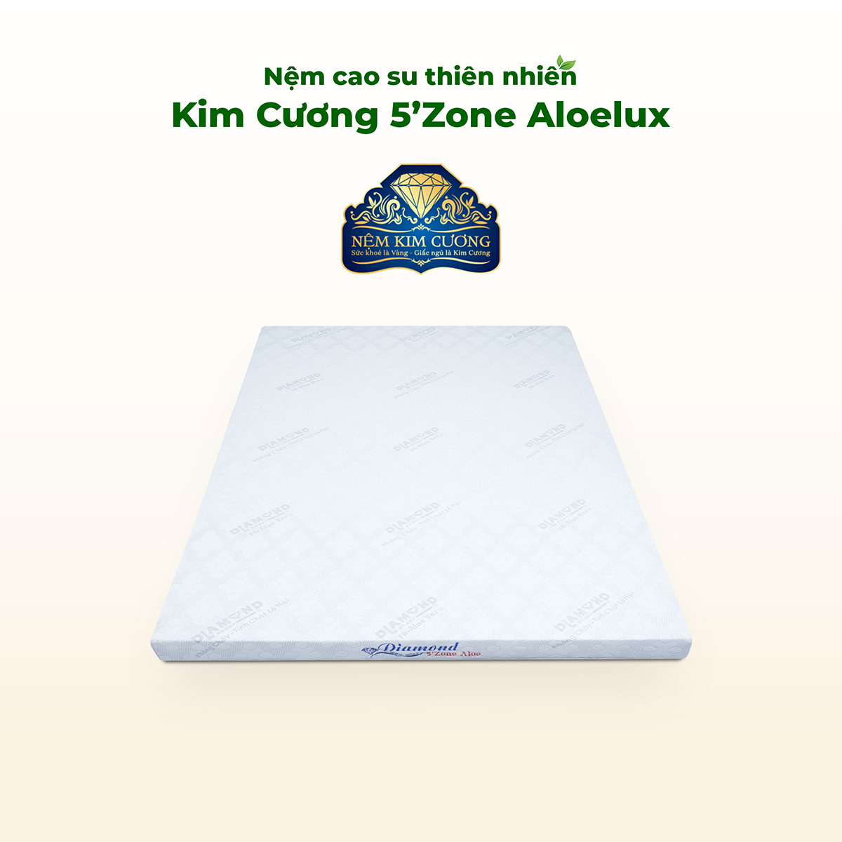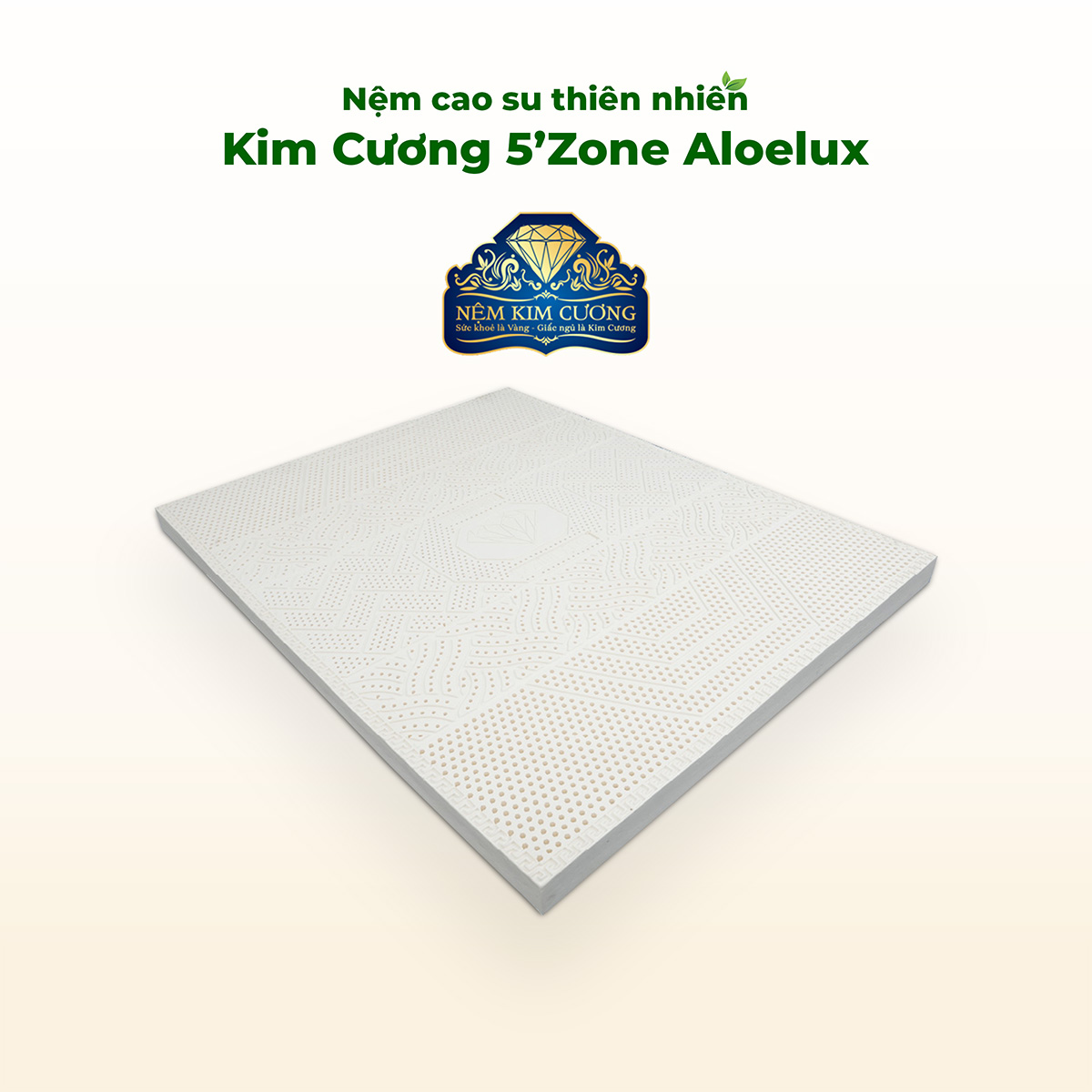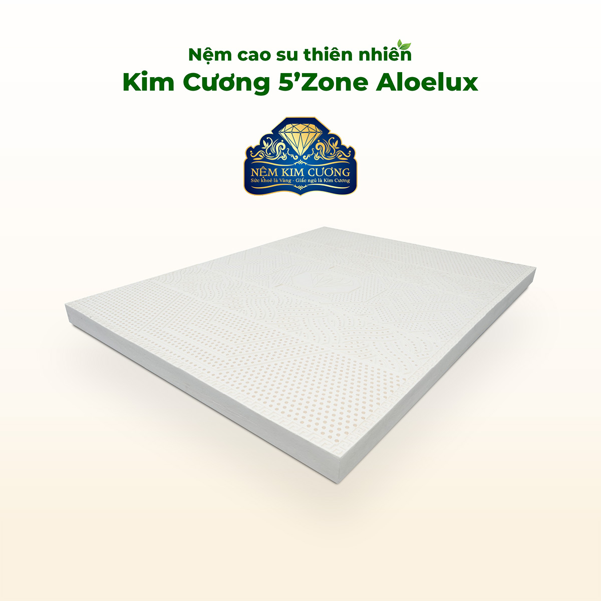 Nệm cao su thiên nhiên Kim Cương 5’Zone Aloelux được làm từ 100% cao su thiên nhiên. Kết cấu nệm phân làm 5 vùng, tương thích với 5 vùng trọng điểm trên cơ thể, lần lượt là: đầu, lưng, hông, đùi, chân.