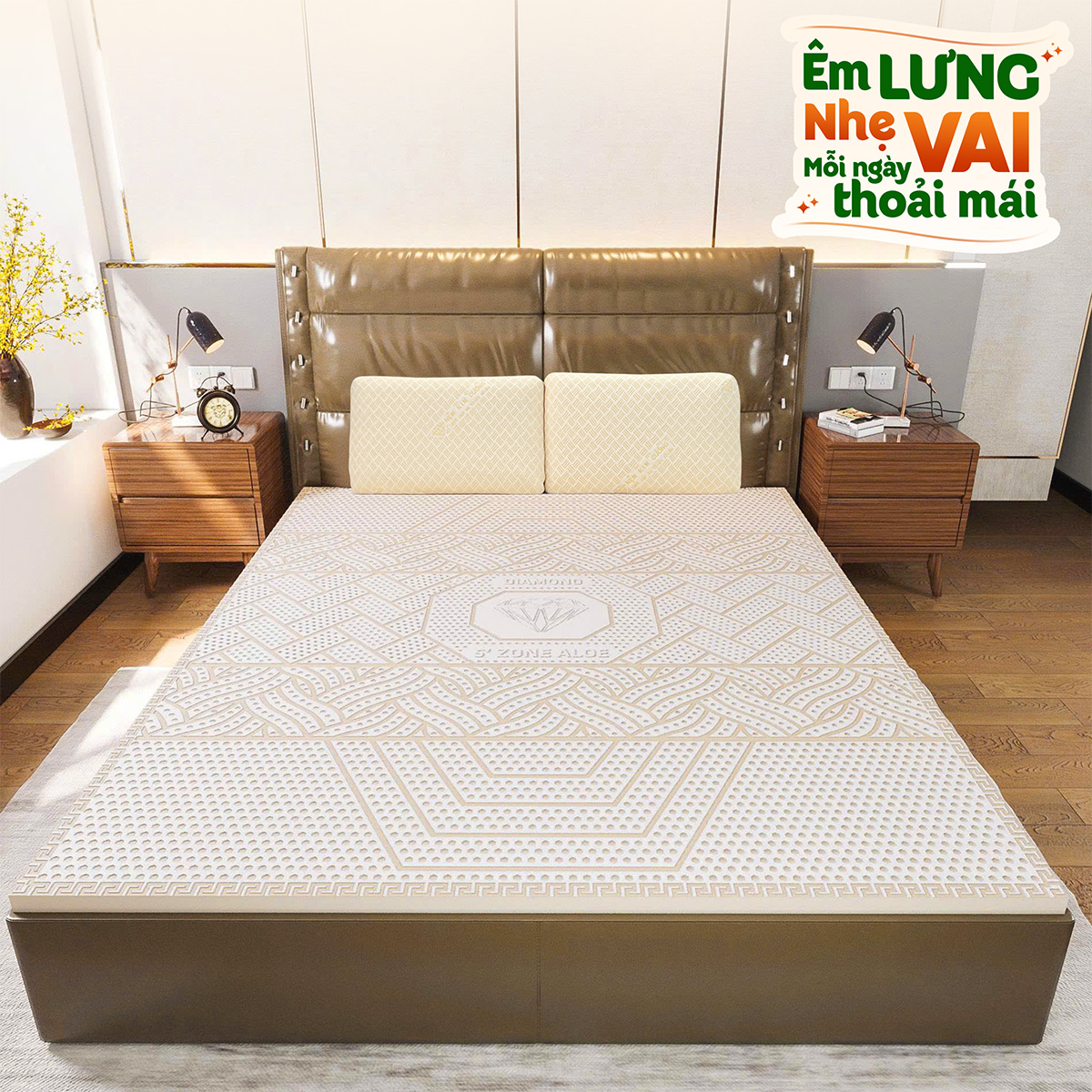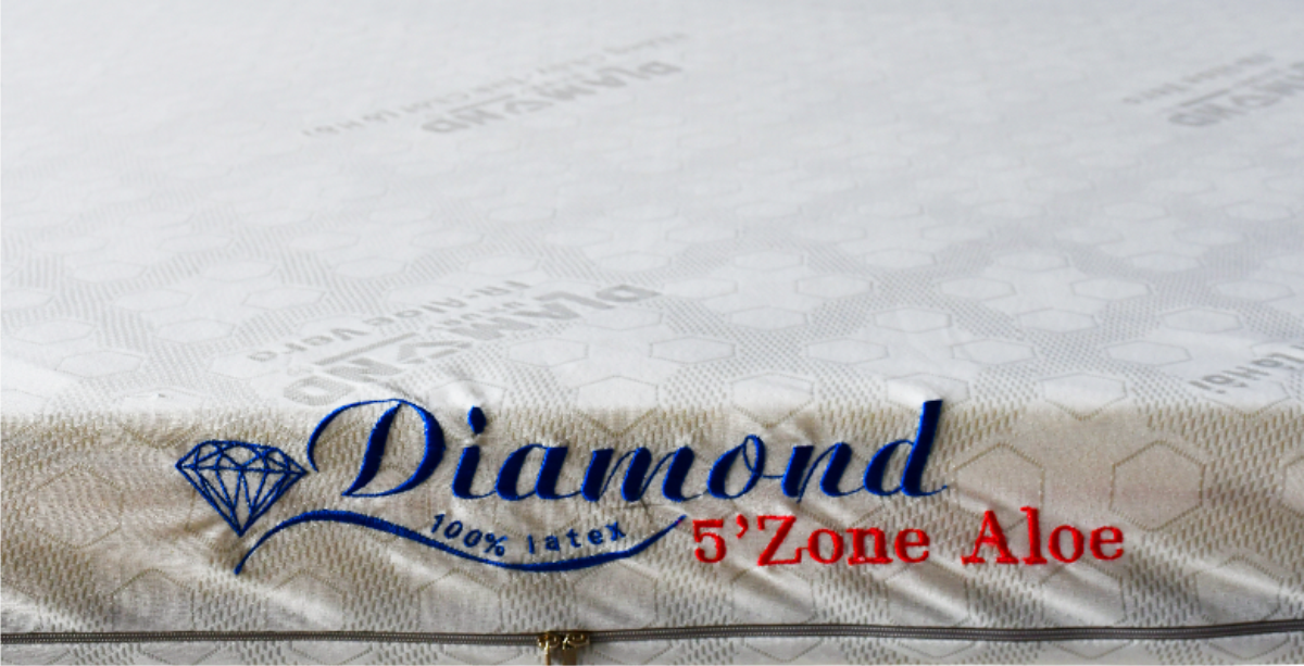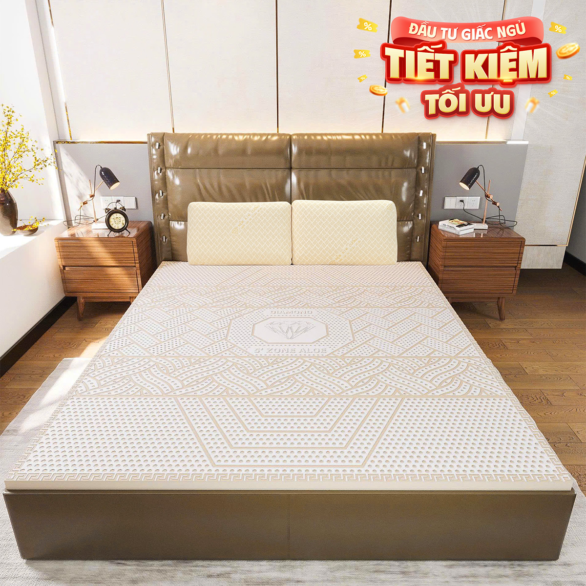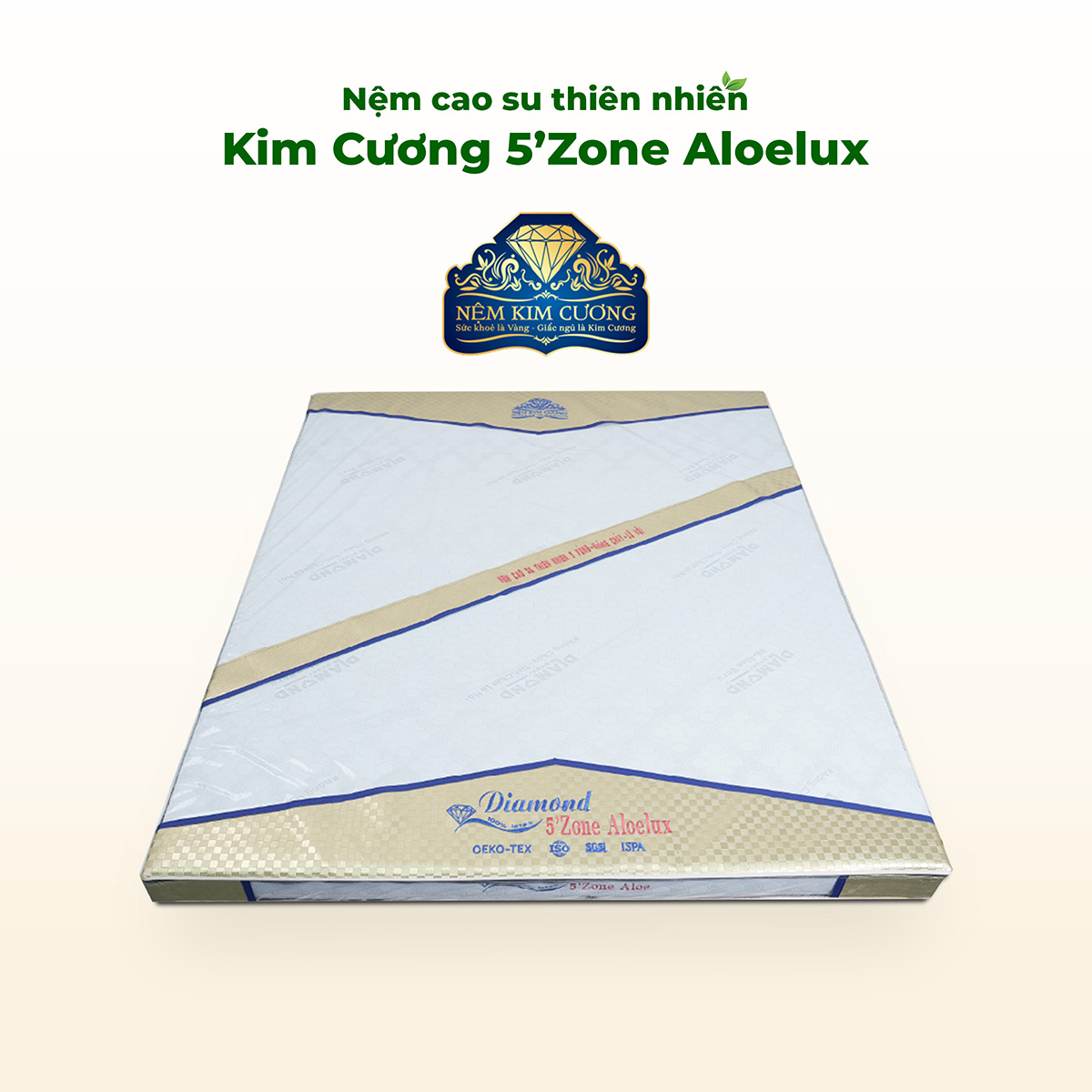 Nệm cao su thiên nhiên Kim Cương 5’Zone Aloelux được làm từ 100% cao su thiên nhiên. Kết cấu nệm phân làm 5 vùng, tương thích với 5 vùng trọng điểm trên cơ thể, lần lượt là: đầu, lưng, hông, đùi, chân.