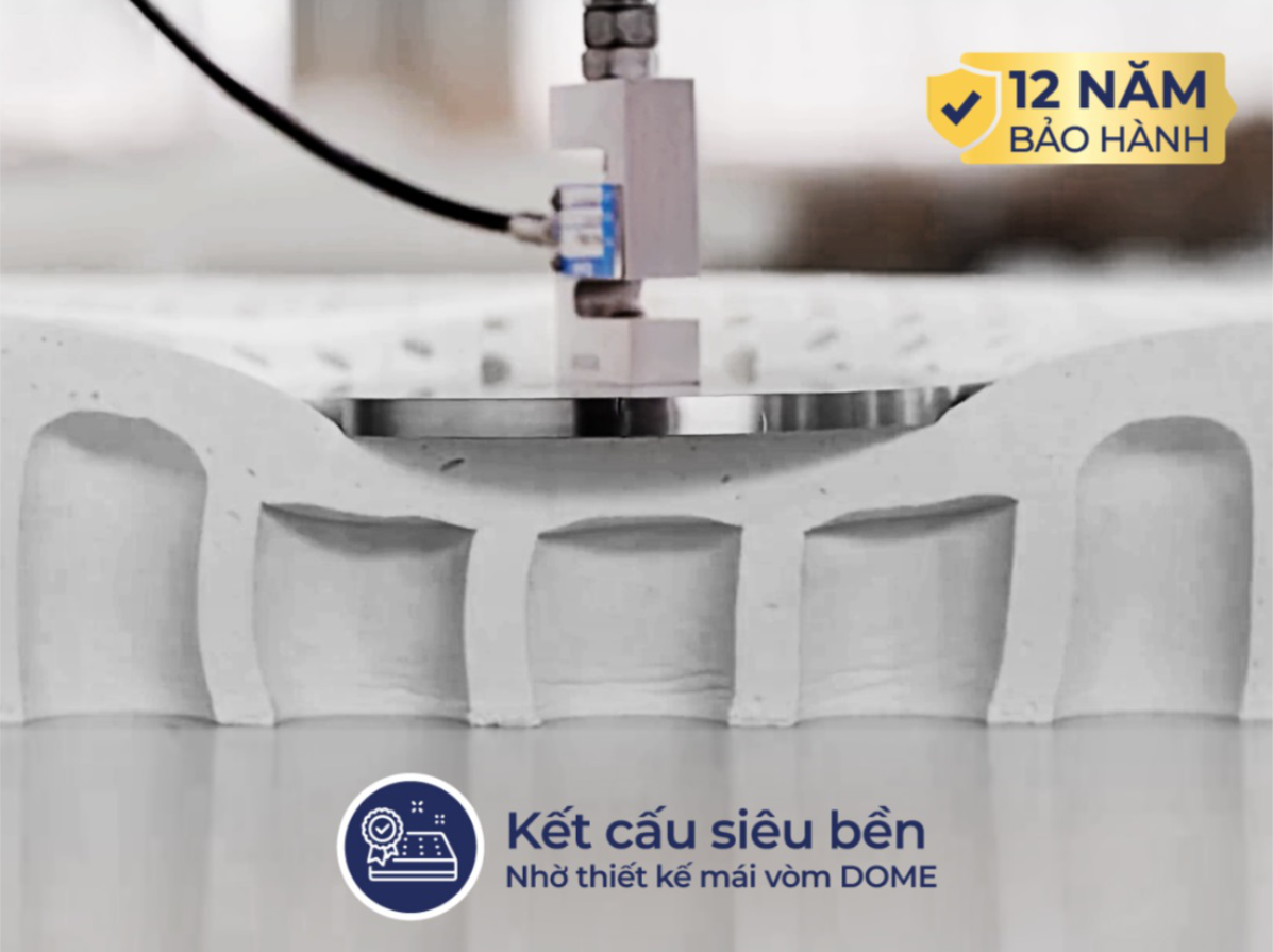 Thiết kế mái vòm mang đến kết cấu siêu bền, hạn chế xẹp lún và không thay đổi hình dạng ngay cả khi không xoay đảo chiều nệm suốt quá trình sử dụng. Điều này đã được kiểm chứng thông qua một loạt bài kiểm tra chất lượng nghiêm ngặt, bao gồm bài kiểm tra đặc biệt với trục lăn nặng 145kg. Kết quả cho thấy, nệm cao su thiên nhiên Liên Á L’ADOME Grey chịu được hơn 120.000 lần, gấp đôi số lượng vòng lăn trên nệm cao su có cấu trúc ô vuông truyền thống.