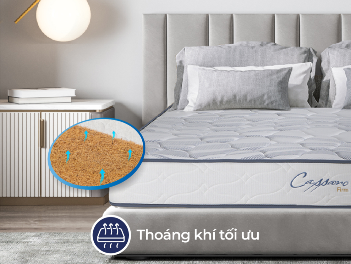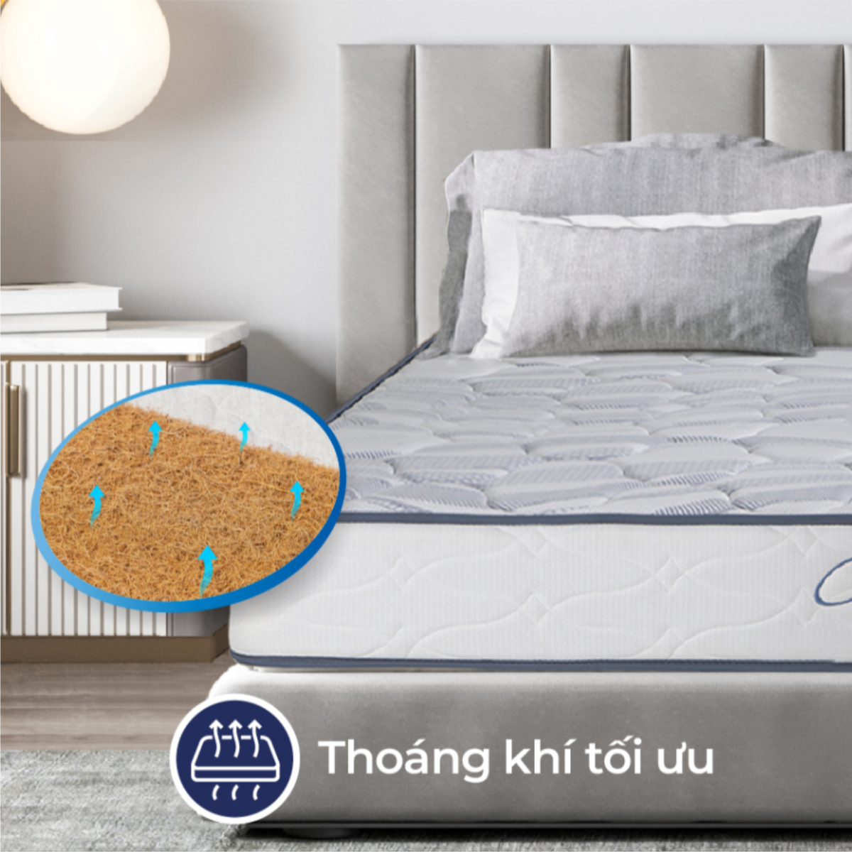 Lớp xơ dừa tự nhiên trong cấu trúc nệm có khả năng kháng khuẩn, khử mùi và hút ẩm tốt, giúp tạo sự thông thoáng cho nệm và mang đến cảm giác mát mẻ, khô ráo khi ngủ, đặc biệt phù hợp với khí hậu nóng ẩm tại Việt Nam. Ngoài ra, chất liệu này đã qua xử lý loại bỏ các tạp chất có hại, đảm bảo an toàn cho sức khỏe, không gây kích ứng da, phù hợp với cả trẻ em và người lớn tuổi.