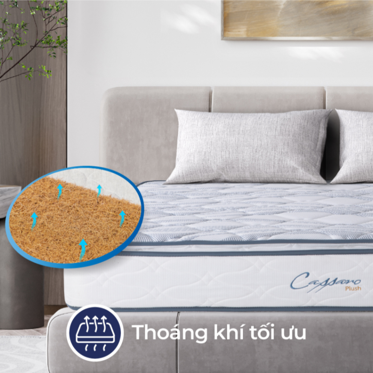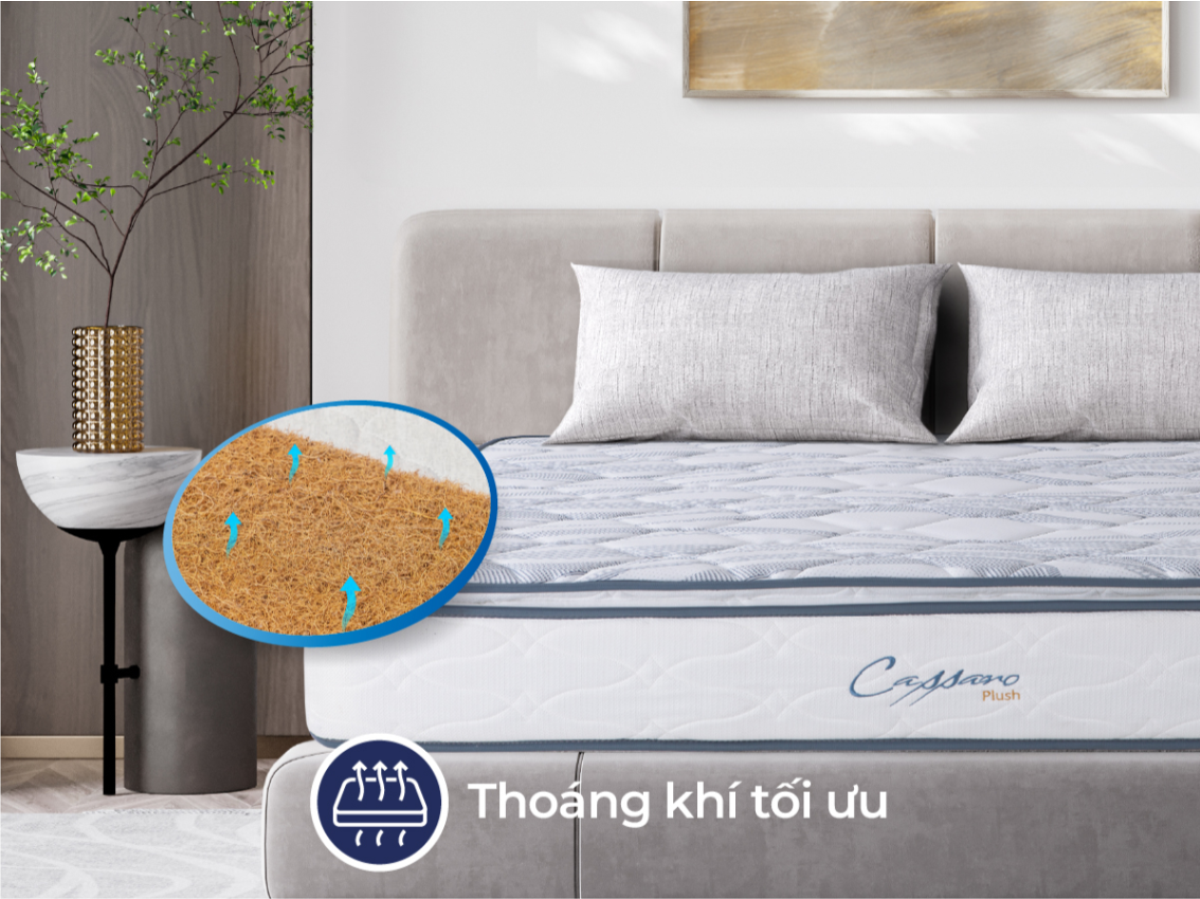 Lớp xơ dừa tự nhiên trong cấu trúc nệm có khả năng kháng khuẩn, khử mùi và hút ẩm tốt, giúp tạo sự thông thoáng cho nệm và mang đến cảm giác mát mẻ, khô ráo khi ngủ, đặc biệt phù hợp với khí hậu nóng ẩm tại Việt Nam. Ngoài ra, chất liệu này đã qua xử lý loại bỏ các tạp chất có hại, đảm bảo an toàn cho sức khỏe, không gây kích ứng da, phù hợp với cả trẻ em và người lớn tuổi.