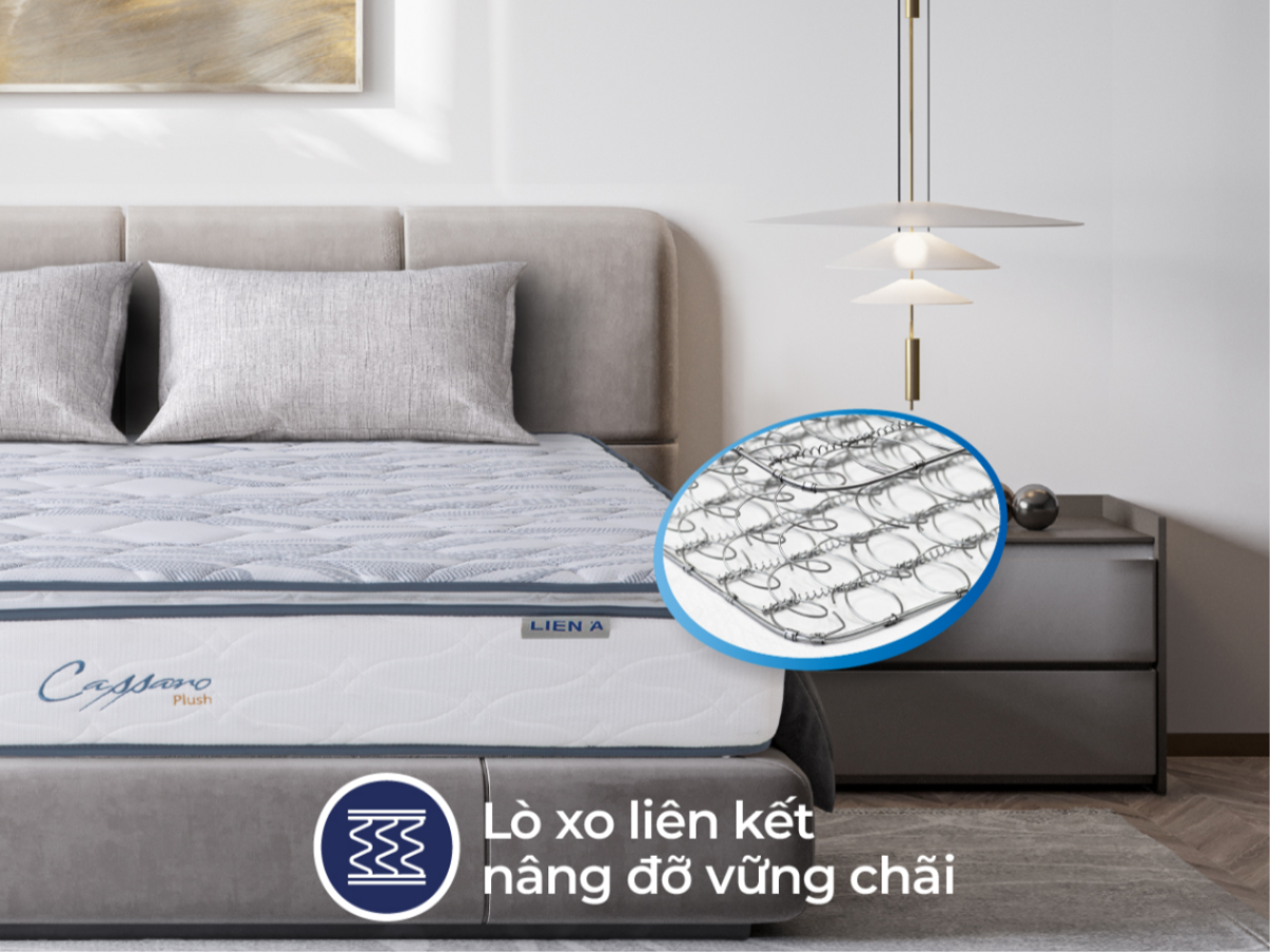 Nệm lò xo Liên Á Cassaro Plush kết cấu lò xo liên kết, nệm có khả năng đàn hồi và nâng đỡ tốt với mọi trọng lượng cơ thể. Nguyên liệu thép cao cấp nhập khẩu cùng với kỹ thuật uốn lò xo tỉ mỉ chuyên nghiệp, kiểm định kỹ càng từng khâu giúp cho hệ thống lò xo của nệm vận hành êm mượt, hạn chế tiếng động, lan tỏa lực đều ở mọi vị trí nệm, tránh hiện tượng móp méo biến dạng.