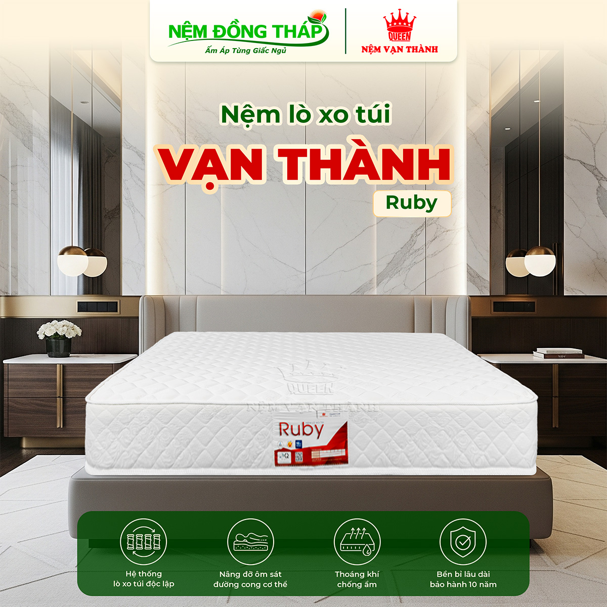 Thời gian bảo hành 10 năm bởi công ty Nệm Vạn Thành.