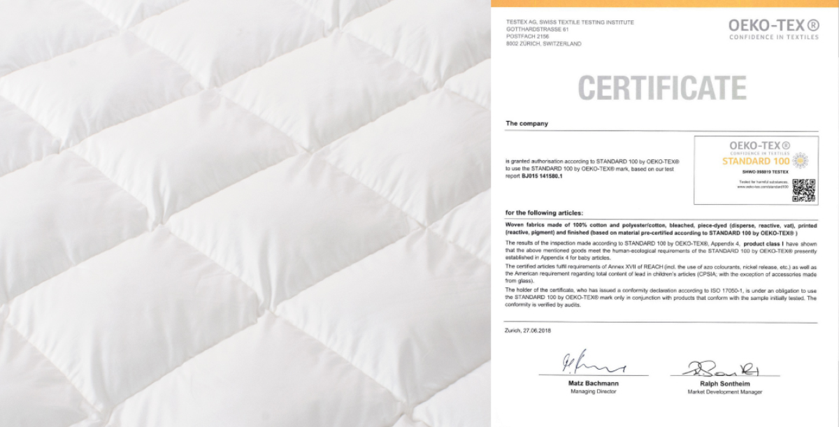 Vải 100% cotton 240 Tc được Nệm Ưu Việt nhập đạt chứng nhận OEKO-TEX (nhóm product class 1). Đảm bảo không chứa chất gây ung thư Formaldehyde, hoàn toàn an toàn cho sức khỏe người sử dụng, đặc biệt là rất phù hợp với trẻ sơ sinh và trẻ nhỏ (đến 36 tháng tuổi). Chính vì thế, bạn hoàn toàn yên tâm về chất lượng khi sử dụng sản phẩm.