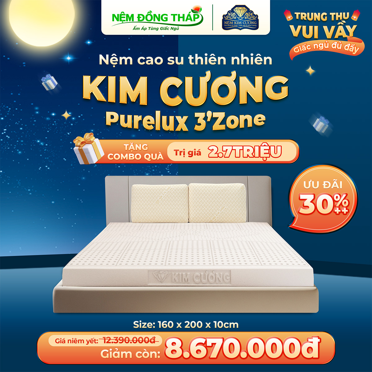 Nệm cao su thiên nhiên Kim Cương Purelux 3’Zone – Ưu đãi 30% + Tặng combo quà trị giá 2.700.000đ