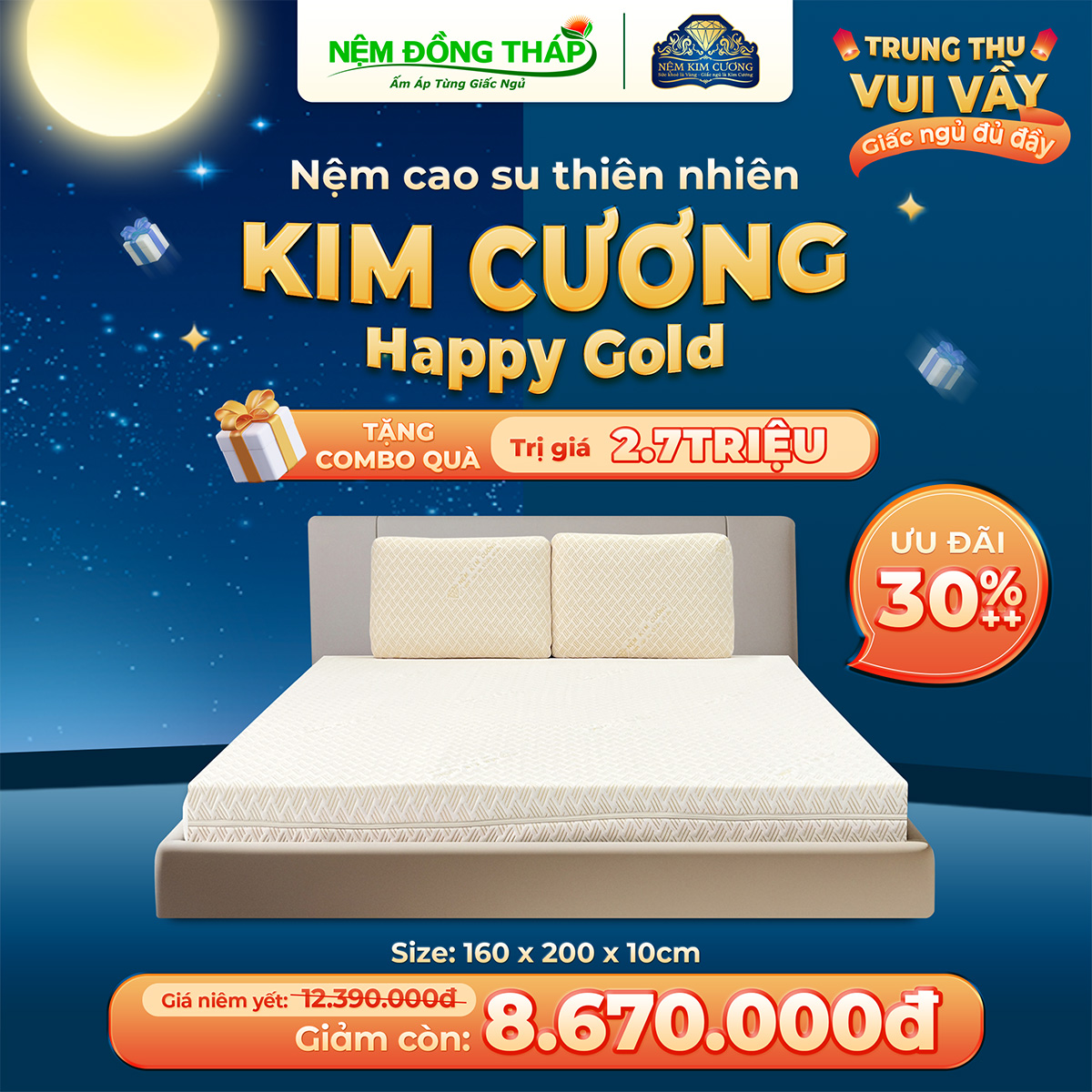 Nệm cao su thiên nhiên Kim Cương Happy Gold – Ưu đãi 30% + Tặng combo quà trị giá 2.700.000đ