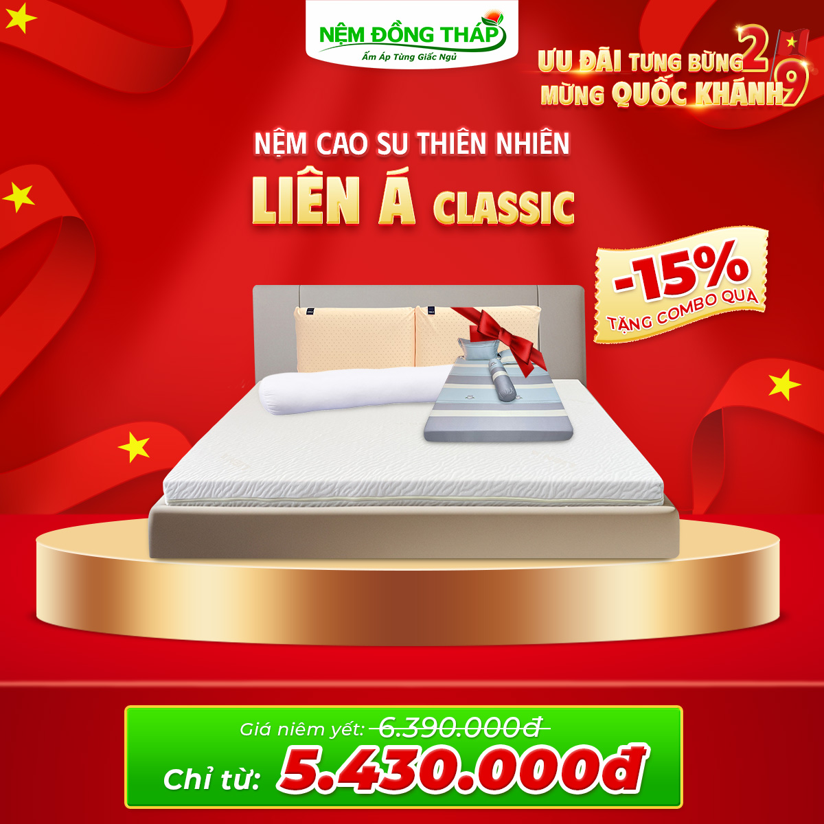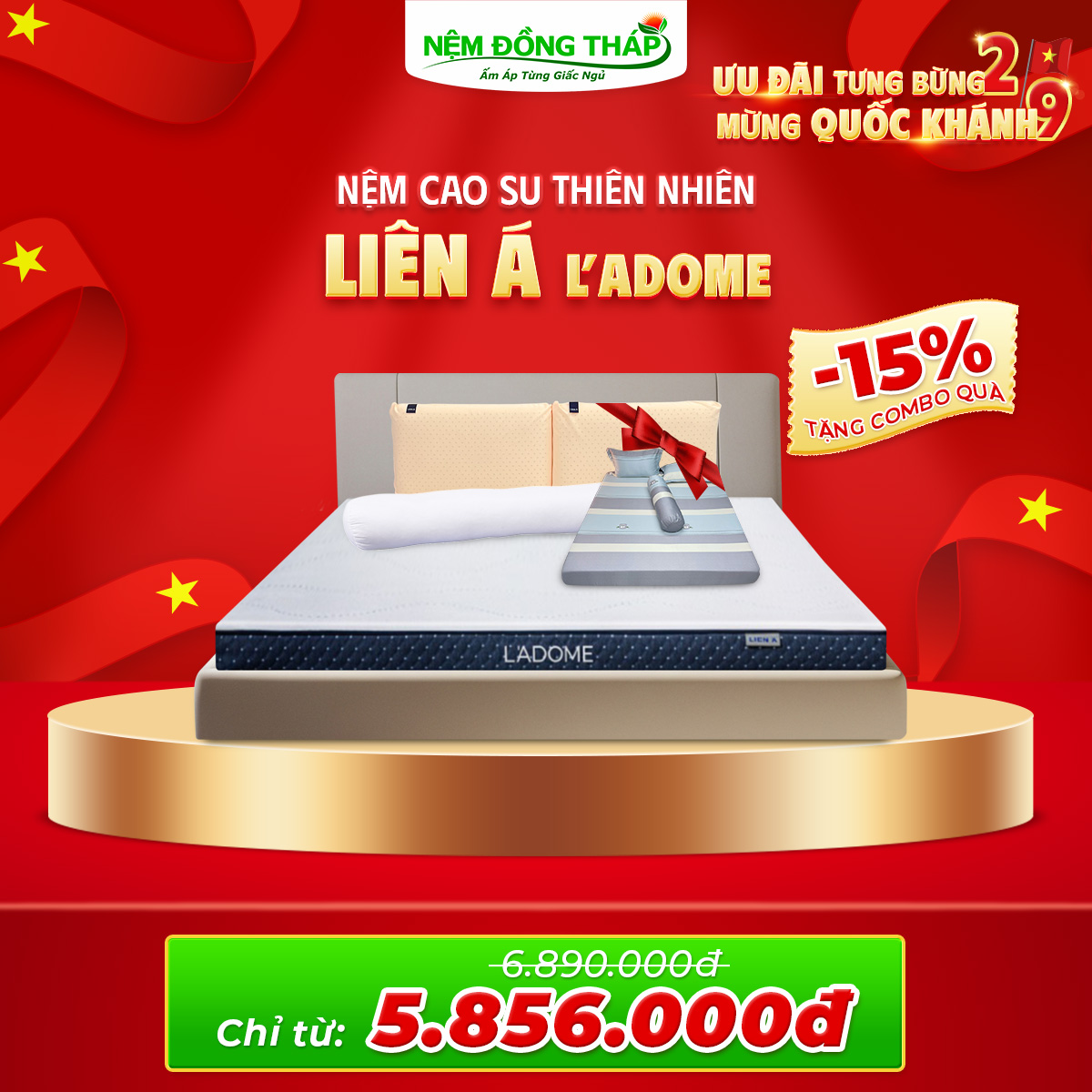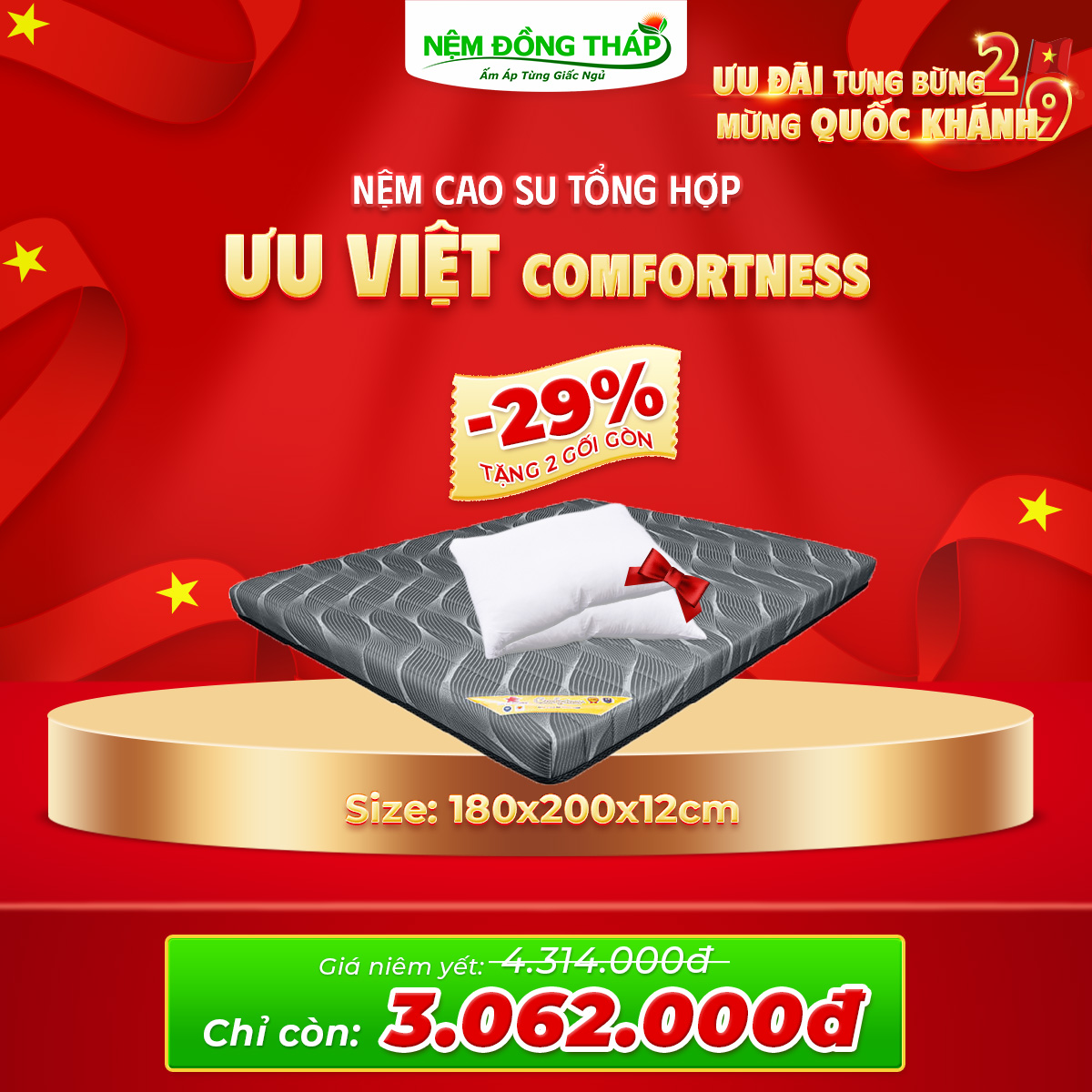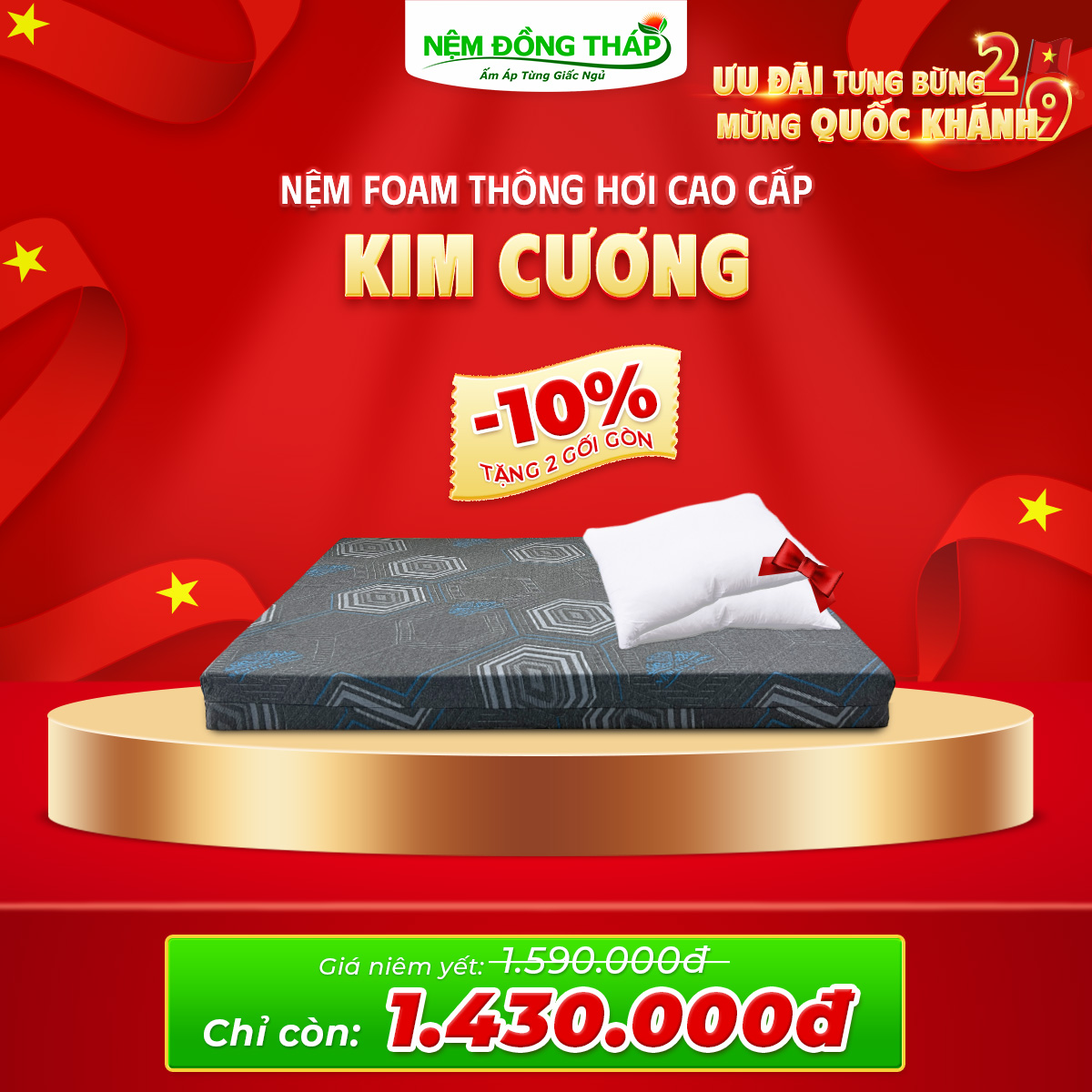 Nhân dịp Quốc Khánh 2/9, Nệm Đồng Tháp trân trọng gửi đến Quý Khách hàng chương trình khuyến mãi đặc biệt với mức giá hấp dẫn chưa từng có. Đây là cơ hội vàng để bạn nâng cấp không gian nghỉ ngơi, chăm sóc giấc ngủ và sức khỏe cả gia đình.