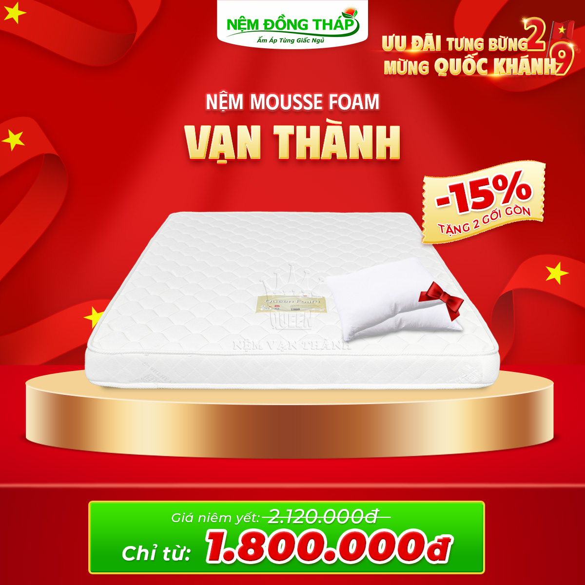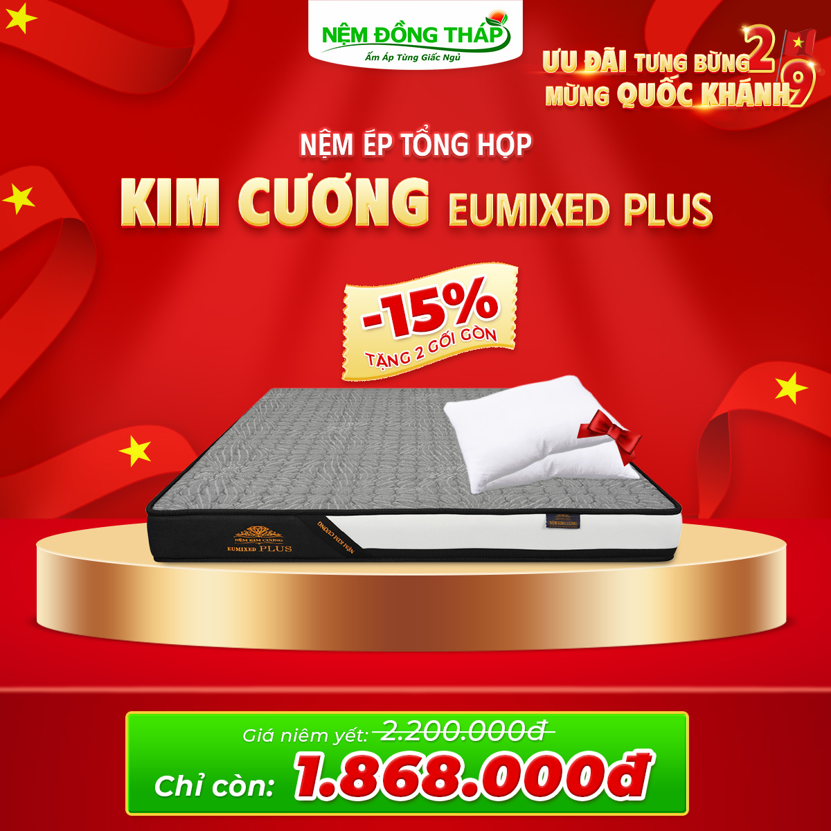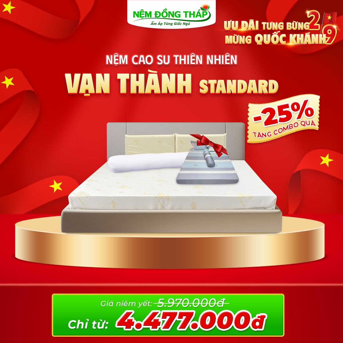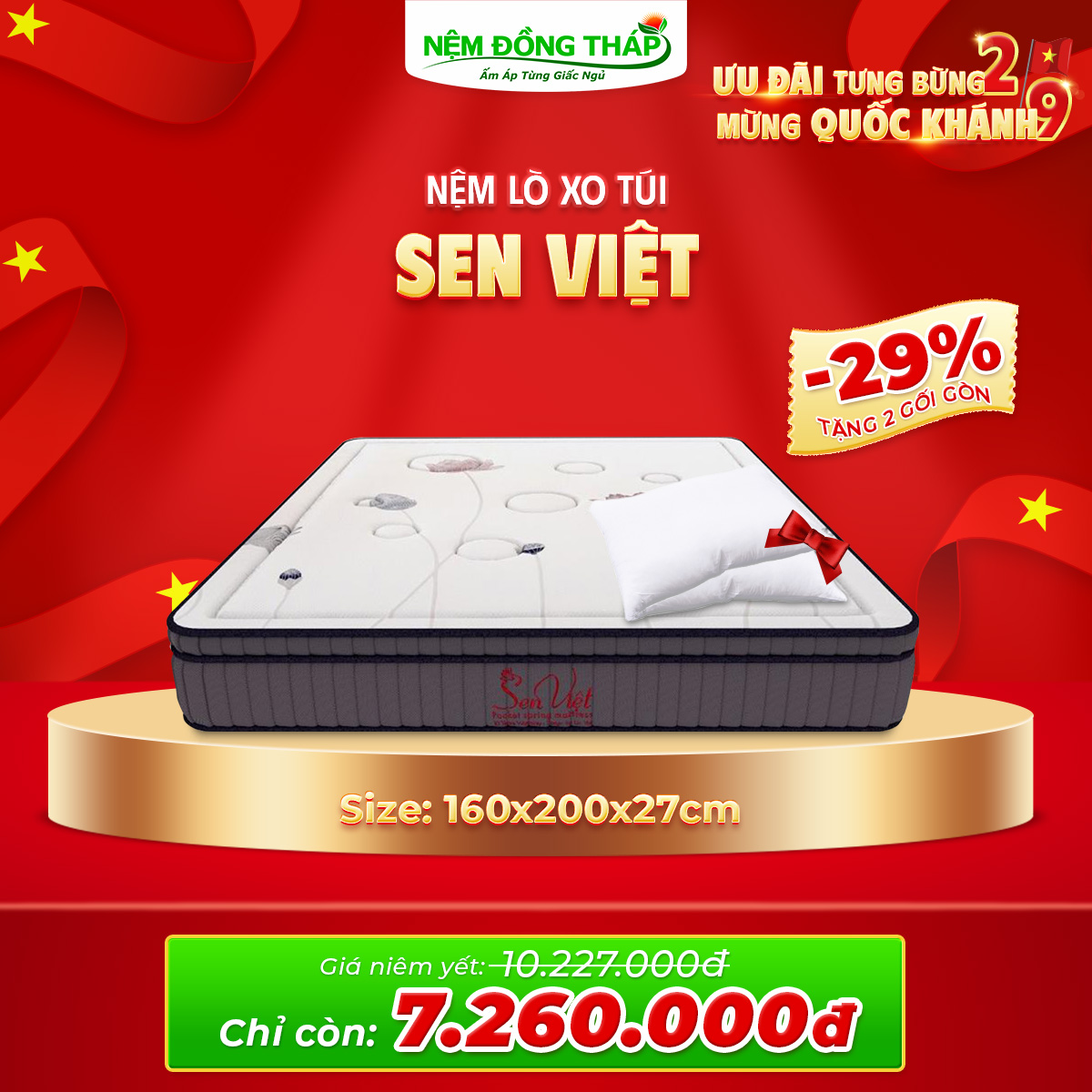Nhân dịp Quốc Khánh 2/9, Nệm Đồng Tháp trân trọng gửi đến Quý Khách hàng chương trình khuyến mãi đặc biệt với mức giá hấp dẫn chưa từng có. Đây là cơ hội vàng để bạn nâng cấp không gian nghỉ ngơi, chăm sóc giấc ngủ và sức khỏe cả gia đình.